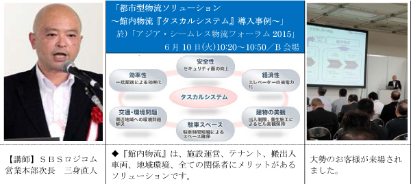 6月 10 日・11 日に開催された「アジア・シームレス物流フォーラム 2015」(株式会社流通研究社様主催)のセミナーにおいて、SBSグループの物流事業の中核を担うSBSロジコム株式会社の営業本部次長・三身直人は「館内物流サービス」をテーマに講演いたしましたのでお知らせします。