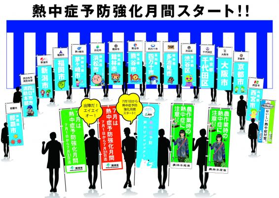 上記参加自治体では、各自治体の庁舎前等で同日同時刻一斉に“出陣式のぼり“を掲げて出陣式を実施し、来庁者の皆様に「熱中症に気をつけて」と声をかけながら、熱中症対策ドリンク、ウチワ、熱強新聞を無料配布いたします。