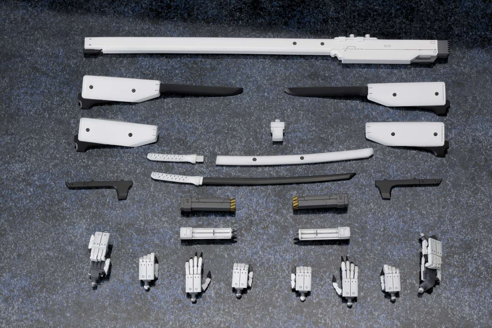 付属品:新デザインの「超高速弾体加速装置」/補助的な腕部武装である「高速連射砲」「鋭針炸裂弾」/劇中未登場で弐瓶氏デザインの模型オリジナル刀「東亜重工製二式複合人工カビ刀」/「谷-704」などのマーキングが入っているデカール/衛人を特徴づける掌位(しょうい)ギミック再現用の「二機掌位再現用手首」及び「三機以上掌位再現用手首」。