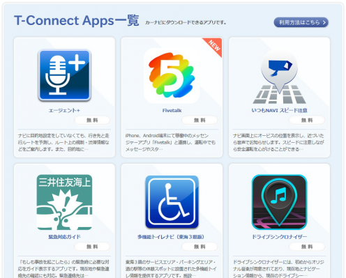 今般、「Apps」で公開した車載用チャットアプリ『Fivetalk』は、運転中のコミュニケーションを安全、快適にサポートするアプリで、運転中に届いたメッセージの「音声読み上げ機能」、ナビ画面を操作することなく予め設定した定型文やスタンプを自動返信できる「自動返信機能」、停止時に簡単なタッチ操作で返信できる「簡単返信機能」等、安全を配慮した設計となっています。 本アプリは、当社子会社・株式会社HighLabが提供するスマートフォン版チャットアプリ『Fivetalk』と連動しており、ドライバーは、スマートフォン版『Fivetalk』で取得したID 番号を「T-Connect」ナビの画面上で入力することにより、利用開始 いただけます。