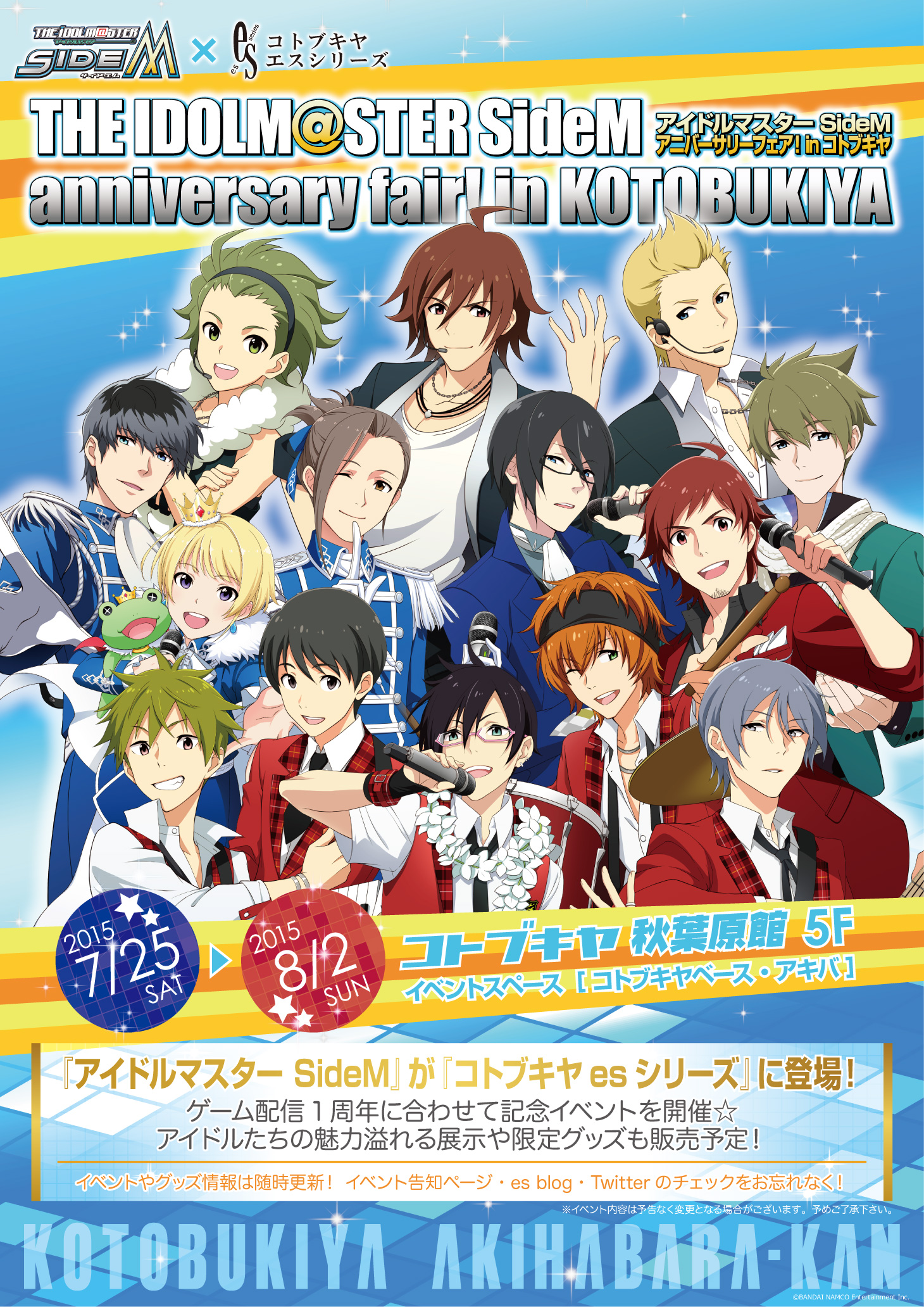 ホビーメーカー株式会社壽屋(本社:東京都立川市曙町/代表:清水一行)の女性向けブランド「es(エス)シリーズ」は、人気ソーシャルゲーム『アイドルマスター SideM』の1周年を記念し、初のコラボイベント『IDOLM@STER SideM anniversary fair! in KOTOBUKIYA』を発表。2015年7月25日(土)~8月2日(日)の期間、コトブキヤ 秋葉原館5階イベントスペース[コトブキヤベース・アキバ]で開催します。