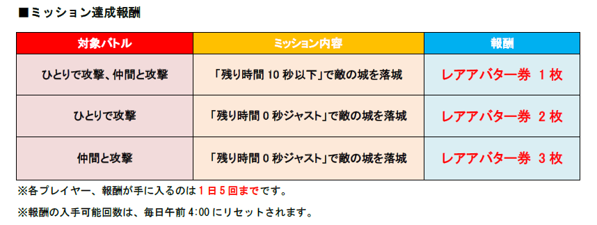 対象のバトルで「残り時間10秒以下」で敵の城を落城させるとレアアバター券を1枚、