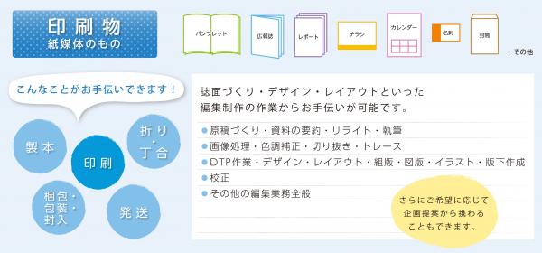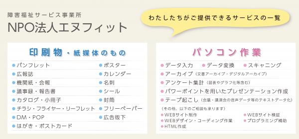 職員による品質管理の徹底をはじめ、元SEやプログラマー、元編集者等が、障害者を直接指導する特色を持つエヌフィットでは、編集制作やデザインから受注可能な「印刷物」、簡易なデータ入力からプログラミングまで幅広い対応が可能な「パソコン作業」を二本柱としています。