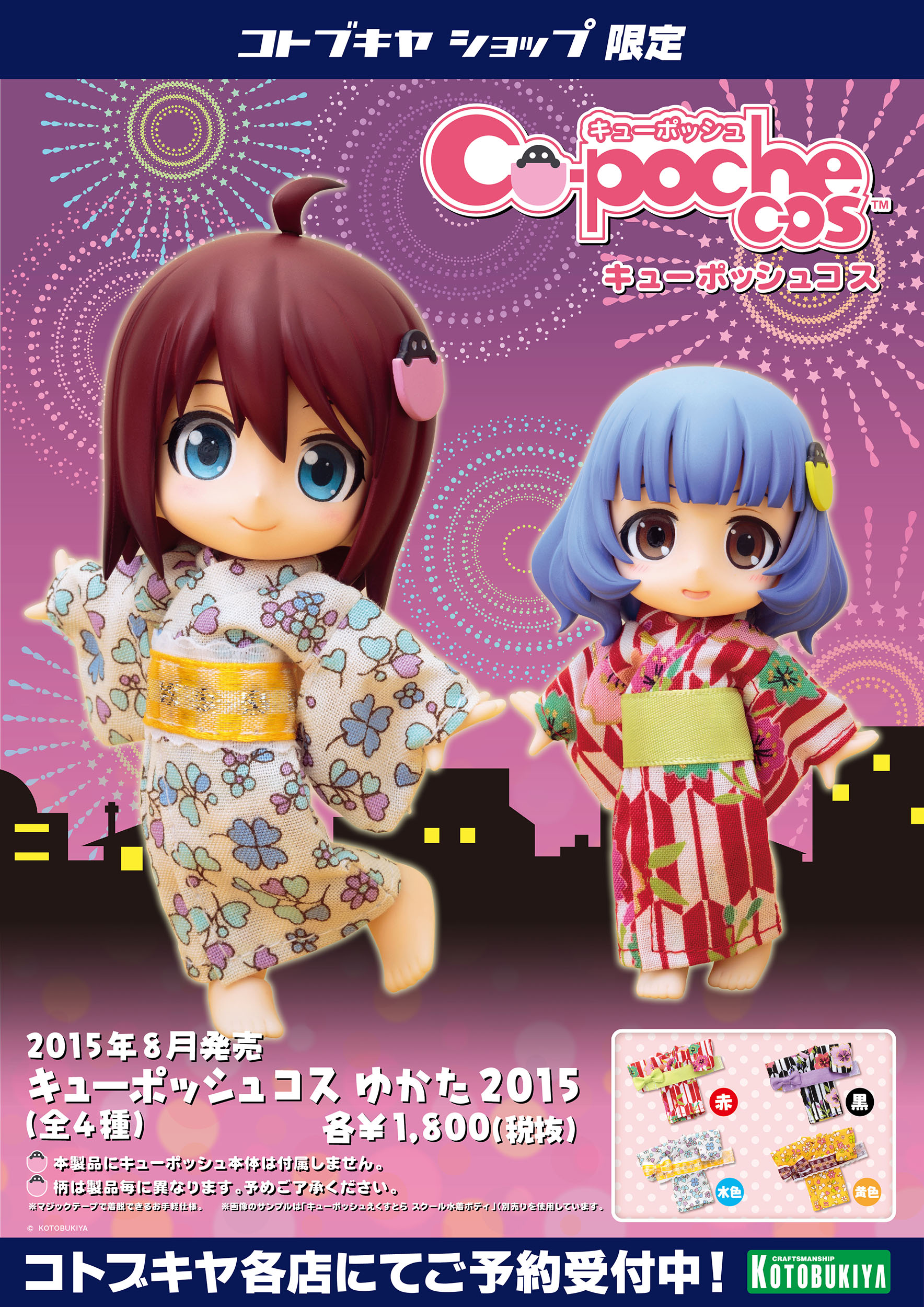 ホビーメーカー株式会社壽屋(本社:東京都立川市曙町/代表:清水一行)は、デフォルメ可動フィギュア“キューポッシュ”シリーズをより楽しめる小さな衣装「キューポッシュコス」シリーズで、同シリーズ第1弾として好評を博した「ゆかた」のデザインを一新し、「ゆかた2015」として2015年8月に発売します。