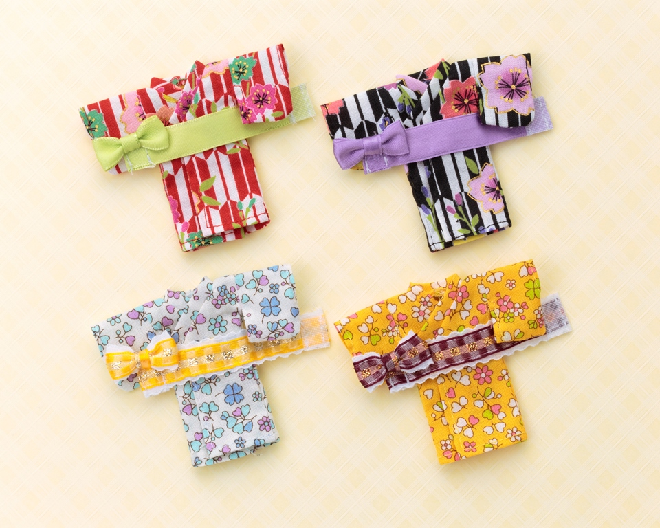 色・柄は矢絣柄の「赤」と「黒」、小花柄の「水色」と「黄色」の4色展開。色毎に色の異なる「帯」がセットになります。夏に欠かせないアイテム「ゆかた」で、お気に入りのキャラクターを可愛く着飾ってください。