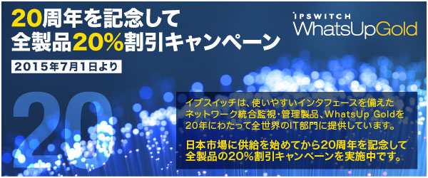 東京、日本 - 2015年7月1日 - 6月3日に発表されたネットワーク統合監視・管理製品、 WhatsUp Gold 16.3 (http://www.whatsupgold.com/jp/products/whatsup-gold-whats-new.aspx)のリリースと、日本のIT部門に製品供給を始めてから20周年になるのを記念して、イプスイッチ社(日本支社名:Ipswitch Japan株式会社、http://www.whatsupgold.com/jp/)が、2015年7月1日より9月30日まで、日本での全製品20%割引キャンペーンを実施します。ネットワークを利用している組織なら、複雑化したネットワークの監視、自動管理は検討に値します。世界から20年以上にわたって信頼を受けてきたイプスイッチ社の製品を20%引きで購入できる機会です。