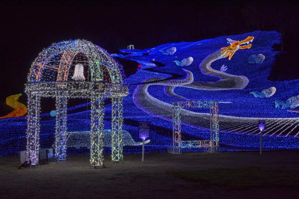 イルミネーションエリアの最も奥の高台に新登場。あなたの願いを龍に届ける「ヒカルチューリップ」など、