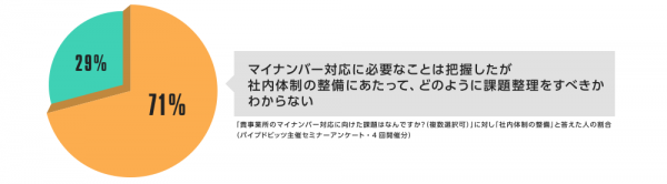企業は、業務フローの整備やシステム構築を2015年内に整備する必要があるものの、パイプドビッツが2015年6月に開催したマイナンバーセミナーの事前アンケートでは、71%にのぼる企業が、社内体制の整備にあたっての課題を整理できていないとわかりました。