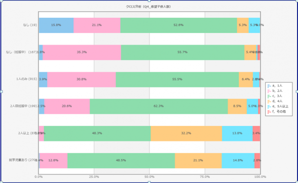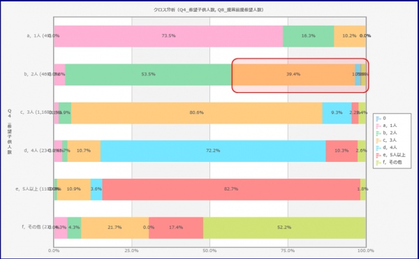 上記問で子どもは2人と応えていた回答者の4割以上は3人以上と回答(クロス集計)