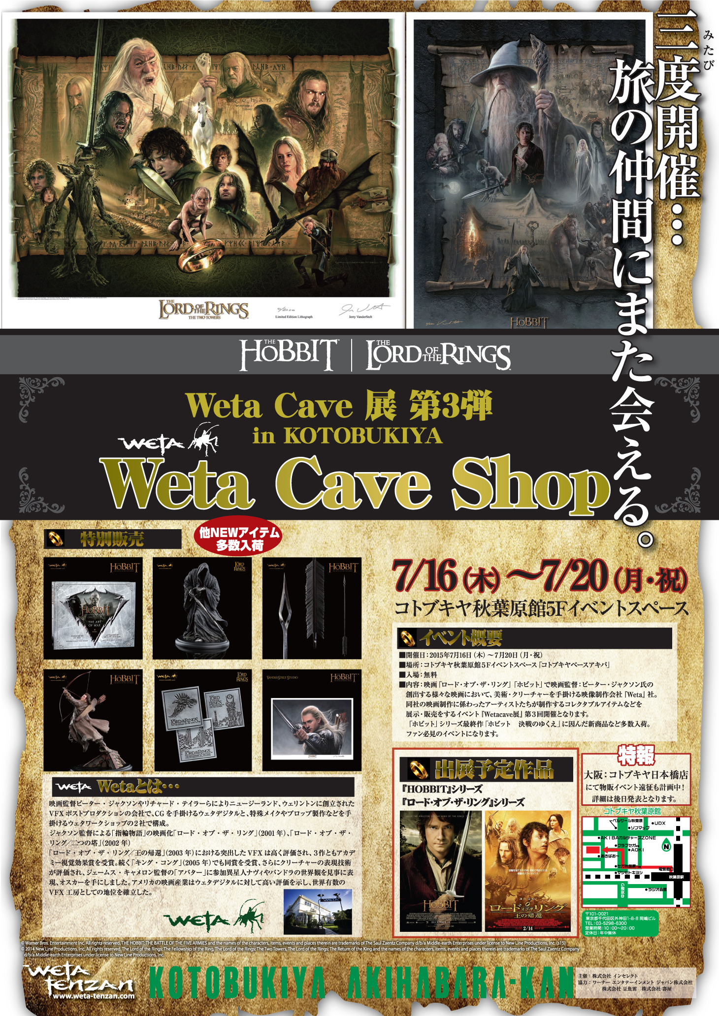 ホビーメーカー株式会社壽屋(本社:東京都立川市曙町/代表:清水一行)は、2015年7月16日(木)より7月20日(月・祝)まで、コトブキヤ 秋葉原館5Fイベントスペース「コトブキヤベース・アキバ」にて、映画『ロード・オブ・ザ・リング』『ホビット』などの美術制作会社「Weta」社のアーティストが手掛ける、コレクタブルグッズを展示・販売するイベント「Weta Cave展3 in AKIHABARA Weta Cave Shop」を開催します。映画シリーズ最終作となる『ホビット 決戦のゆくえ』に因んだ新商品なども販売予定。迫力のスタチューやプロップなどを実際に目で見る事が出来る人気イベントの第3弾となります。