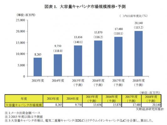◆ 市場予測:2018年度の大容量キャパシタ市場は200億円を超す規模へ成長