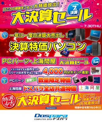 全国22店舗及びウェブ通販のパソコンショップ『ドスパラ』(代表取締役社長:西尾伸雄 本社:東京都千代田区)は、2015年7月3日(金)より『大決算セール』を開始いたしました。ゲームPC 最大5万円引き、週替わりのPCパーツ数量限定特価など、お買得な商品をご用意しております。