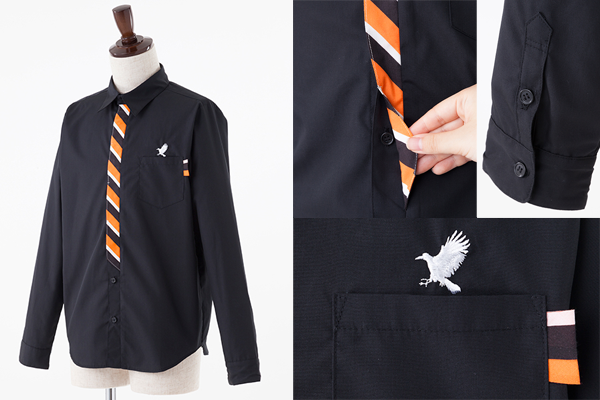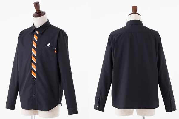 黒のボディに、烏野高校のユニフォームをイメージした、オレンジ・ブラック・ホワイトのななめストライプ柄のネクタイをつけているようなデザインのシャツです。