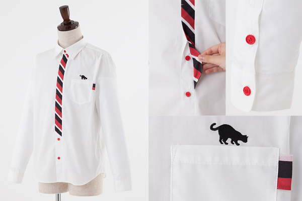白のボディに、音駒高校のユニフォームをイメージした、レッド・ブラック・ホワイトのななめストライプ柄のネクタイをつけているようなデザインのシャツです。