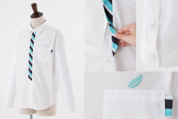 白のボディに、青葉城西高校のユニフォームをイメージした、エメラルドグリーン・ホワイト・ブラックのななめストライプ柄のネクタイをつけているようなデザインのシャツです。