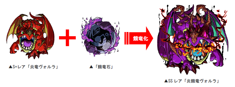「炎竜ヴォルラ」「水竜リース」「地竜ガル」を「餓竜化」したドラゴンへ進化させることができます。