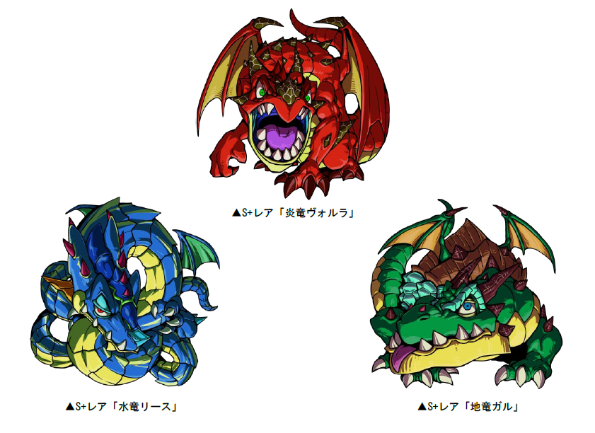 限定S+レア「炎竜ヴォルラ」「水竜リース」「地竜ガル」と交換することができます。