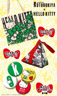 今回のコラボレーションでは、ハローキティがコトブキヤのコーポレートカラーである“緑”のリボンをつけたり、「KOTOBUKIYA」のロゴにキティが迷い込んだりした、この“コラボのためにつくられた新しいデザイン”をコトブキヤ 秋葉原館の大型看板や店舗ディスプレイに使用します。さらに、新しいデザインを使用したKOTOBUKIYA X HELLO KITTYオリジナル限定グッズを含む、コトブキヤセレクトによる様々なコラボレーショングッズや和柄のハローキティ商品を取り揃えたグッズ販売コーナーを特設した店舗ジャックをおこないます。