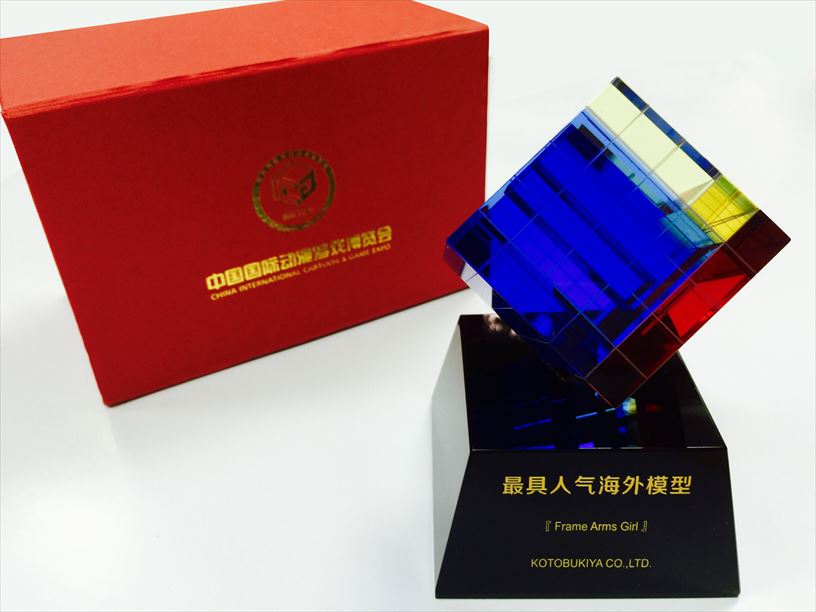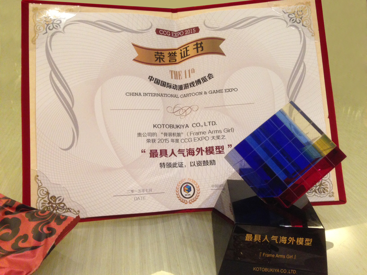 当シリーズに対し、CCG EXPO組織委員会から、「60年以上の歴史を持つホビーメーカー壽屋が2015年に展開し始めたオリジナルプラモデル新シリーズ『フレームアームズ・ガール』は、パーツの組み替えにより高いカスタマイズ性と無限に広がる楽しみ方が実現され、そして美少女プラモデルという画期的な展開は中国のホビーファンを魅了している。オリジナルコンテンツとしてシリーズ第一弾からこれほど高い人気と市場価値を獲得しているのは並大抵のことではない」といった点で高い評価をしていただき、CCG EXPO初の「最人気海外プラモデル賞」受賞となりました。
