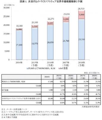 本調査ではIoTを活用した製造業におけるソフトウェアを次世代ものづくりソフトウェアとして捉え、その世界市場規模を試算した。次世代ものづくりソフトウェア世界市場規模は、従来、製造業がものづくりを円滑に行うに当たり活用していたシステムであるPLM( Product Lifecycle Management) 、MOM/MES( Manufacturing Operations Management/Manufacturing Execution System)、SLM(Service Lifecycle Management)に、IoT基盤を加えたものと定義した。