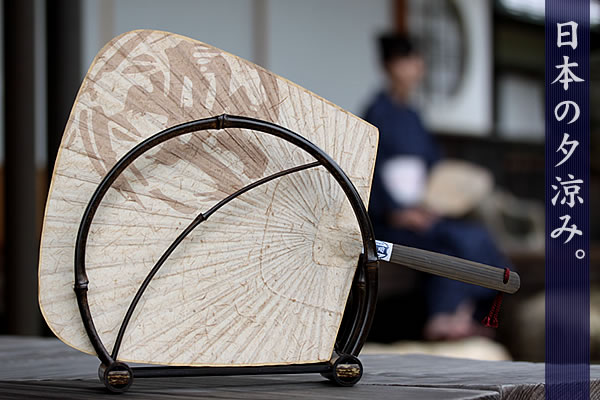 日中の日差しが収まり、あたりが紺色に染まってくれば夕涼みを楽しむのが風流です。そんな情緒的な日本の風景にピッタリ、虎竹和紙で出来た渋引団扇と黒竹の団扇立てセットが新たに登場です。団扇立てがセットで置き場所にも迷わず、厳選した黒竹を使った 団扇立てはインテリアとしても趣があります。