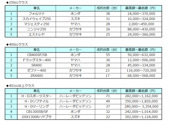 情報流通支援サービスの株式会社オークネット(本社:東京都港区/社長:藤崎清孝)は、 2015年6月度のオークネットバイクオークションにおける成約台数を集計し、排気量別ランキングベスト5をまとめました。