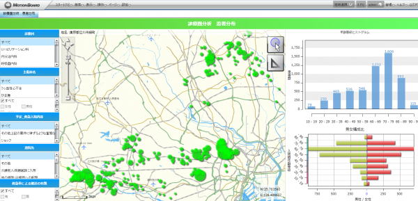 情報活用ダッシュボード 「MotionBoard」でデータの分析を可能にする「可視化モジュール」を提供し、医療データの可視化を実現します。「MotionBoard」はマウスのみの簡単な操作でデータのビジュアル化やOLAP分析が行えるので、ITの専門知識がなくてもチャートやグラフで気づきを得たり、自由な分析を行ったりすることができます。