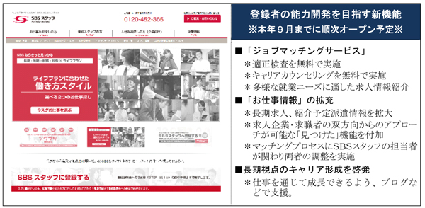 SBSグループで人材サービスを行うSBSスタッフ株式会社(社長:山口英一、本社:東京都墨田区)は、7月1日、サイトを全面的にリニューアルオープンいたしました。以降、9月にかけて段階的にマッチング機能などを拡充してまいります。