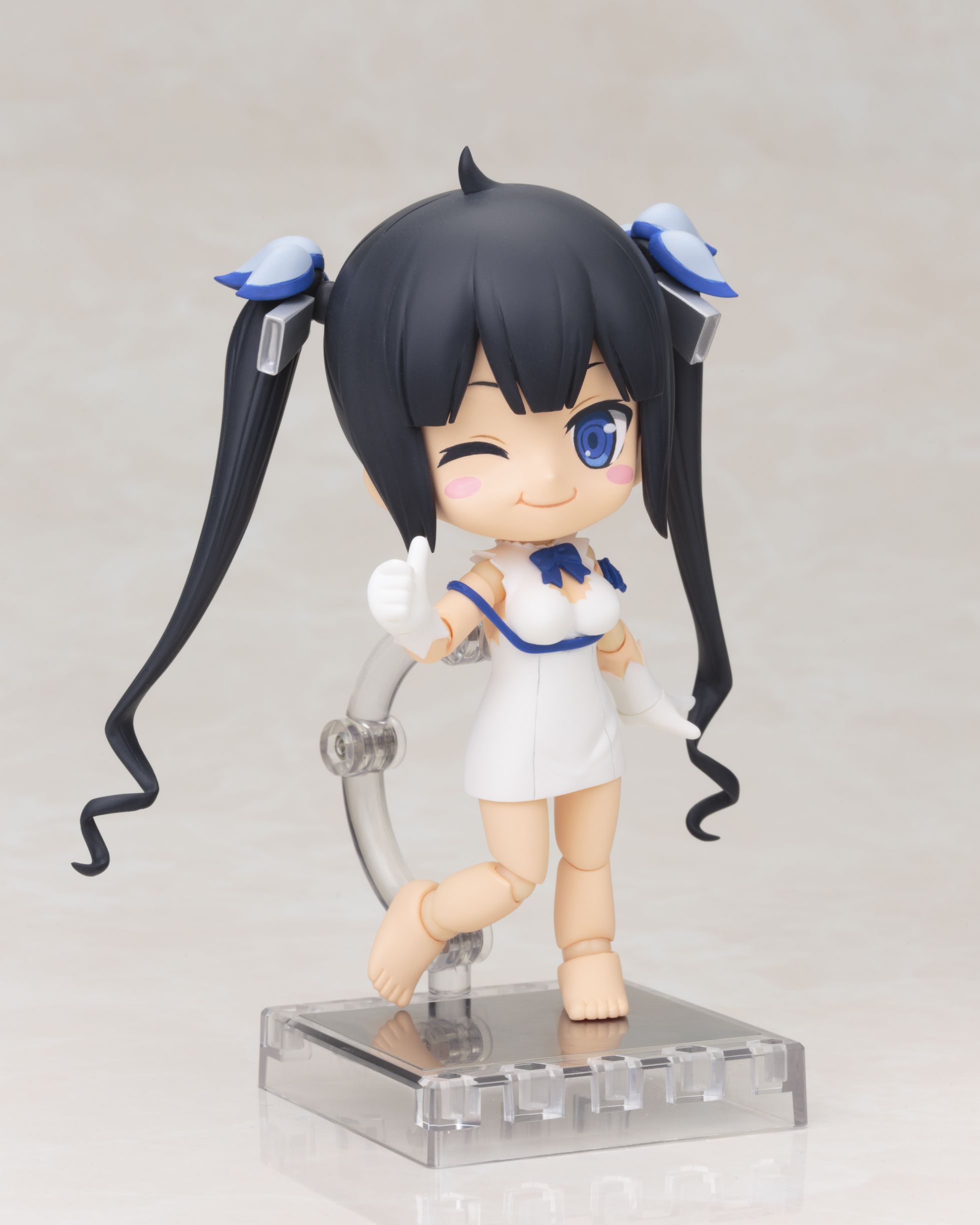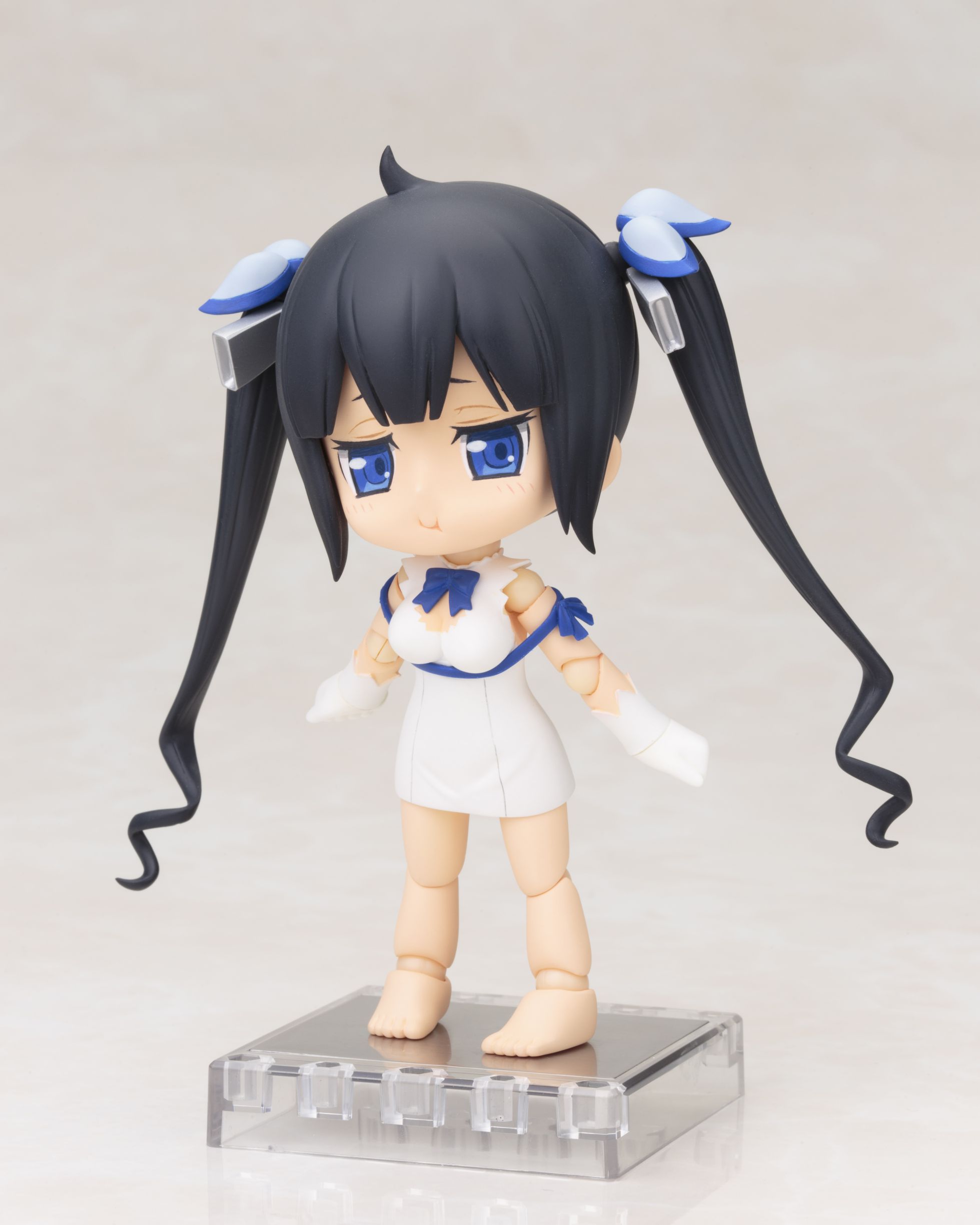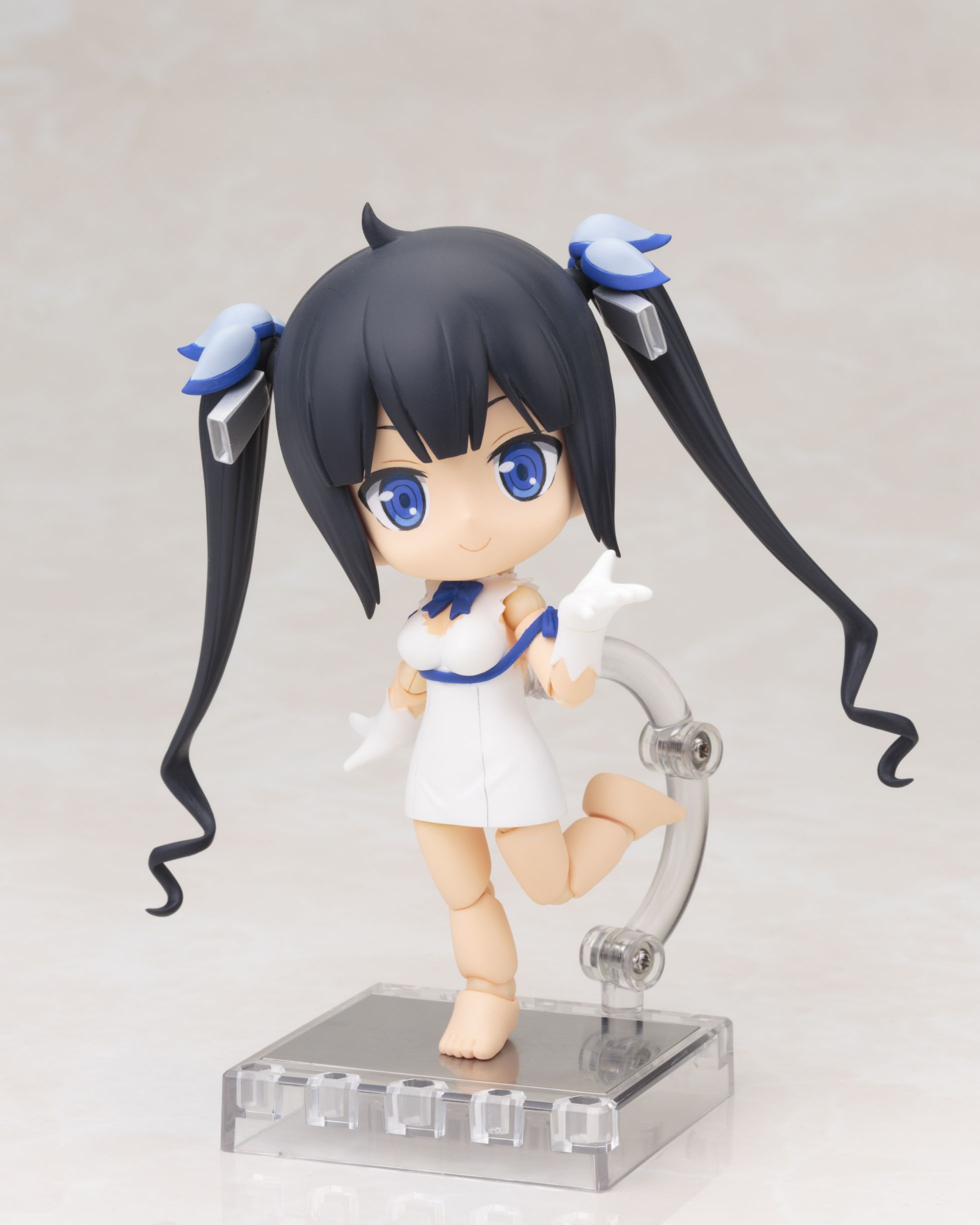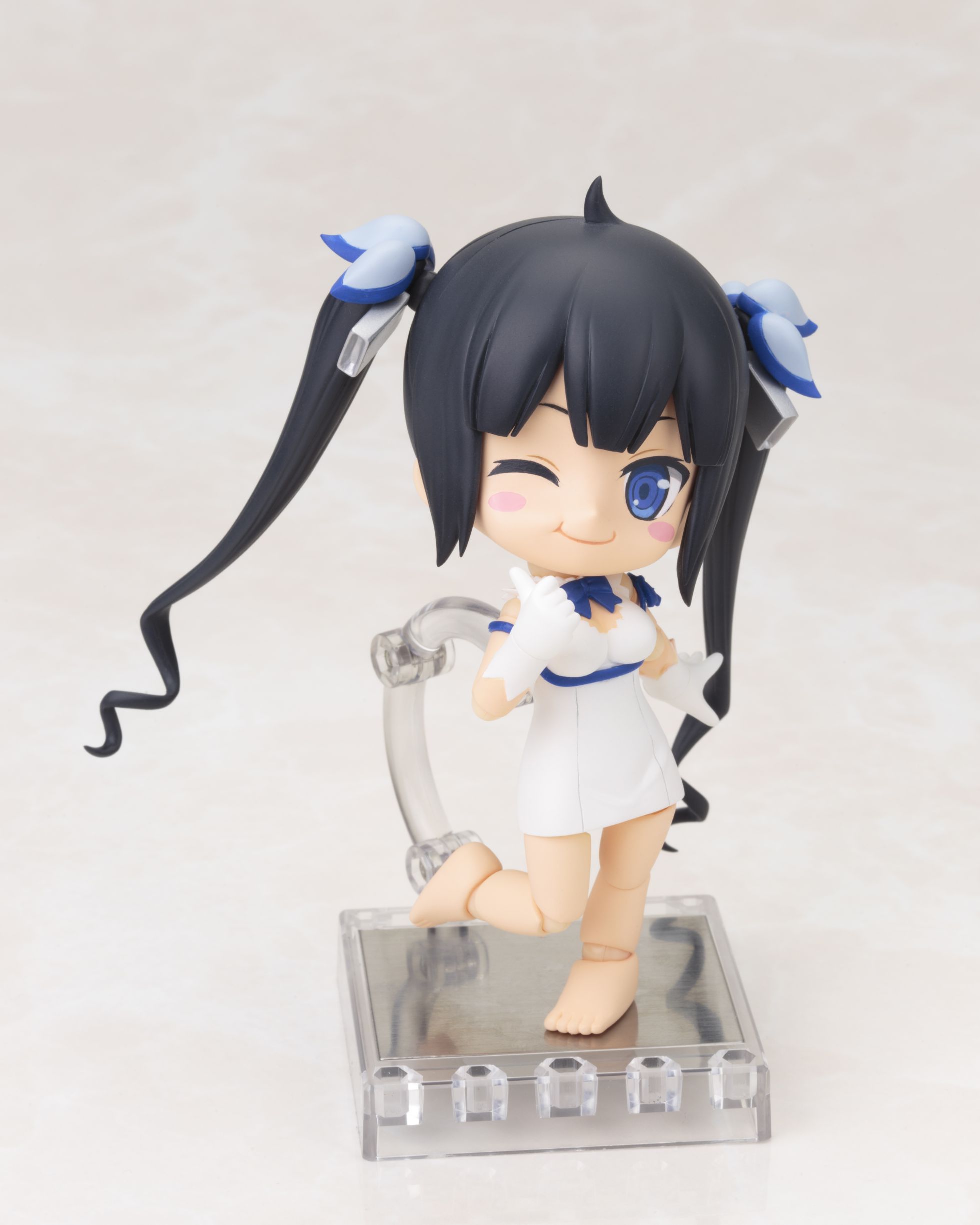 うごいてたのしいポケットさいずのキュートなふぃぎゅあ「キューポッシュ」。シリーズ第24弾は、『ダンジョンに出会いを求めるのは間違っているだろうか』より、主人公であるベル・クラネルの所属する[ファミリア]の主神、ヘスティアが登場です。「キューポッシュ」とは、2.3頭身のデフォルメキャラクターたちの、とっても可愛いポケットサイズの新しい可動フィギュアシリーズです。小さな体に豊富な可動、足裏のマグネットにより専用ベースの上では楽々といろんなポーズがとれ、充実の付属品でキャラクターのいろんな表情や印象的なシーンを再現できます。ヘスティアの胸まわりのブルーのリボンは、腕の動きを邪魔しない少し柔らかめの素材となっています。付属の4種の表情パーツで、表情がころころ変わるカワイイ神様の魅力をお楽しみください。