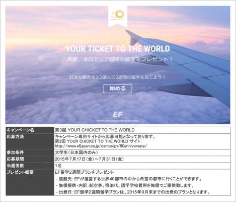 留学、語学教育事業を展開する世界最大級の私立教育機関、EF Education Firstの日本法人である、イー・エフ・エデュケーション・ファースト・ジャパン株式会社(以下、EF)では、2015年7月17日(金)より、大学生を対象にしたキャンペーン「第3回 YOUR TICKET TO THE WORLD」を実施します。本キャンペーンでは、抽選で1名の方にEFが提供する語学留学(2週間)をプレゼント!応募方法は、キャンペーン公式サイトからとなっております。