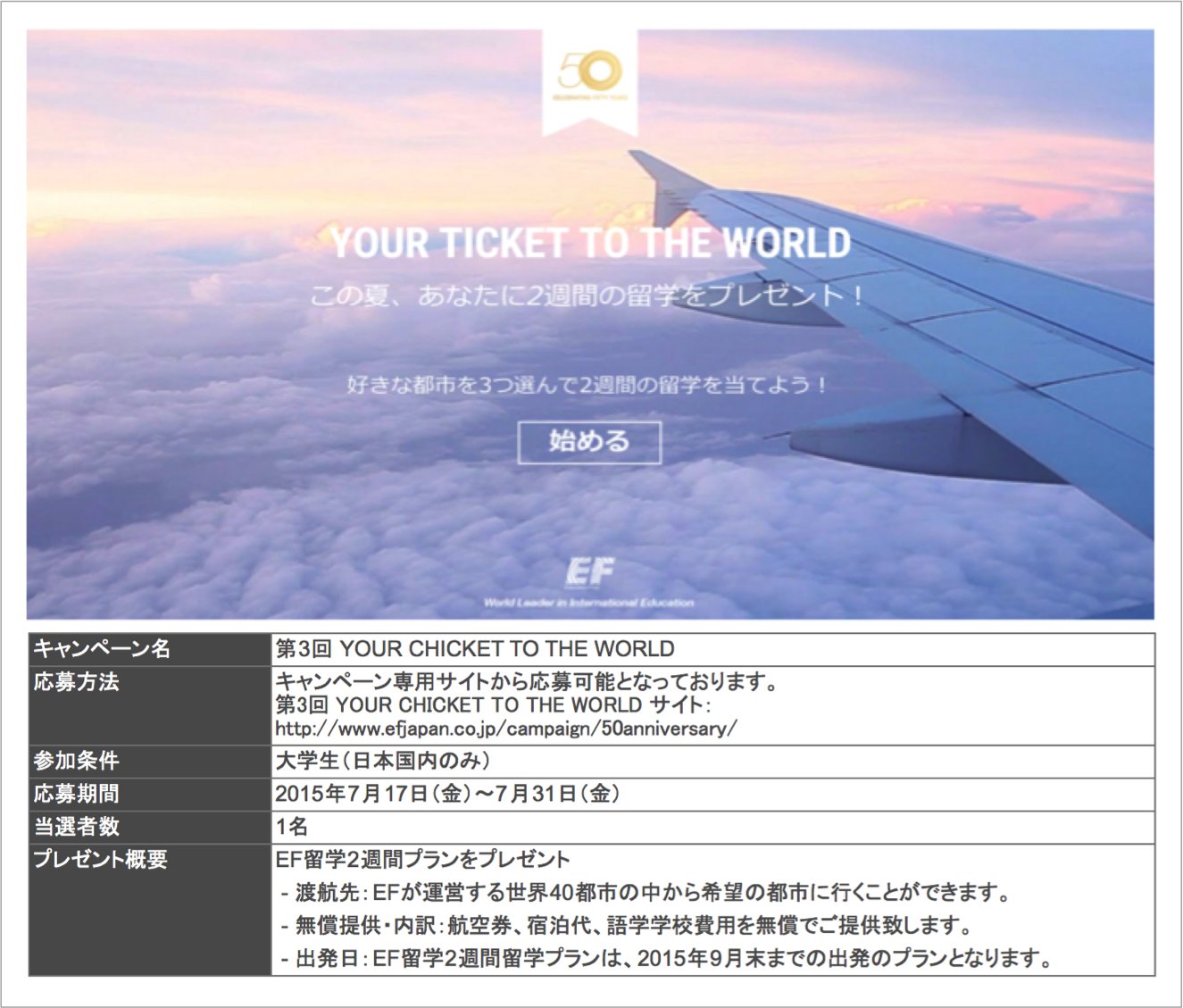 【YOUR TICKET TO THE WORLD】http://www.efjapan.co.jp/campaign/50anniversary