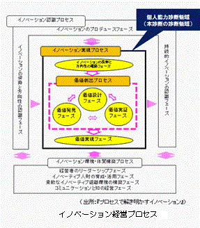<内容>本診断[個人編]では、ITコーディネータ協会監修の『プロセスで解き明かすイノベーション』における「イノベーション経営プロセスガイドライン」に完全準拠して、イノベーション経営プロセス全体における「イノベーション実現プロセス」のフェーズ毎に必要とされる個人の能力要素を、客観的に可視化し、全体平均や企業平均、偏差値と比較して、人財の発掘や育成に繋げることができます。