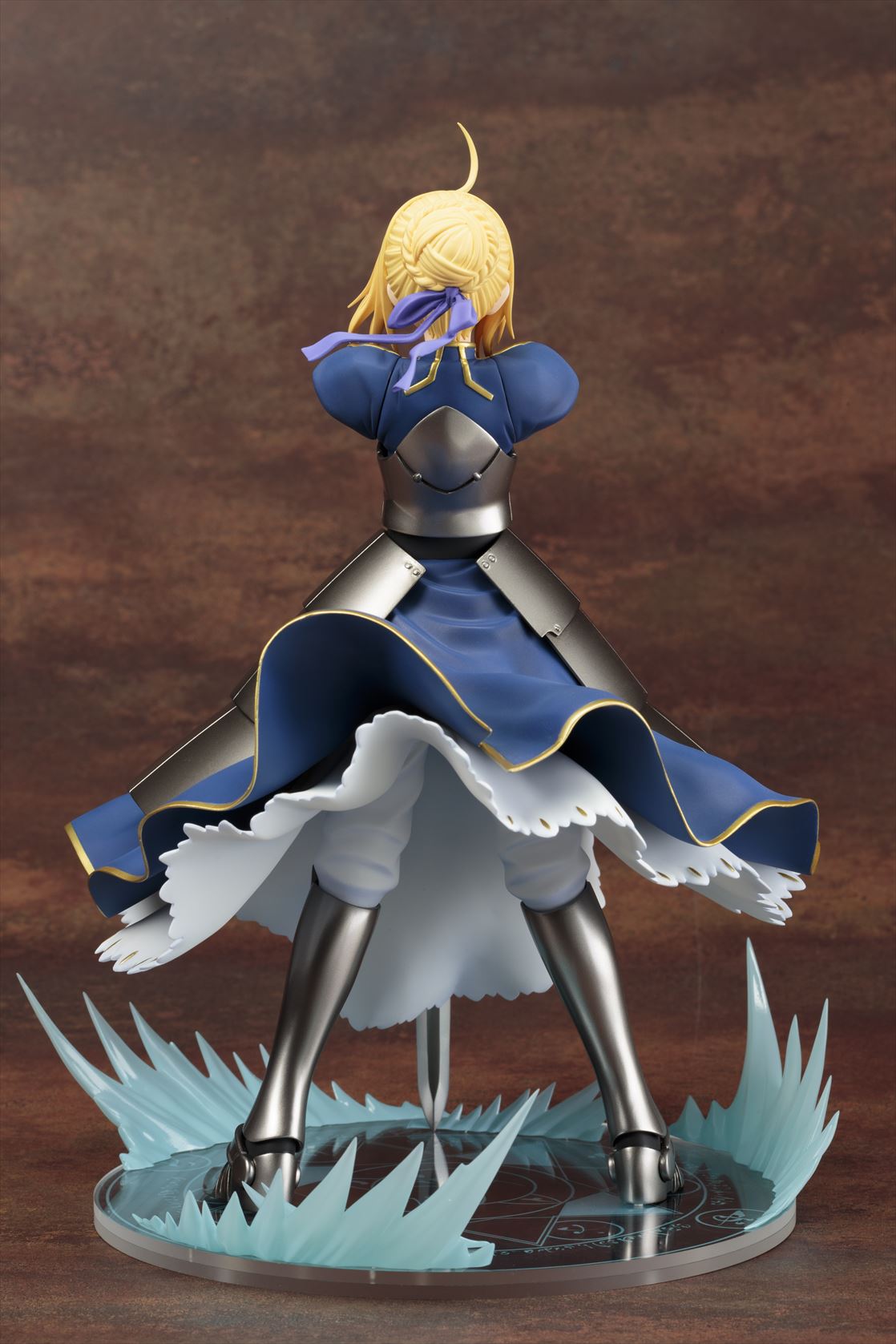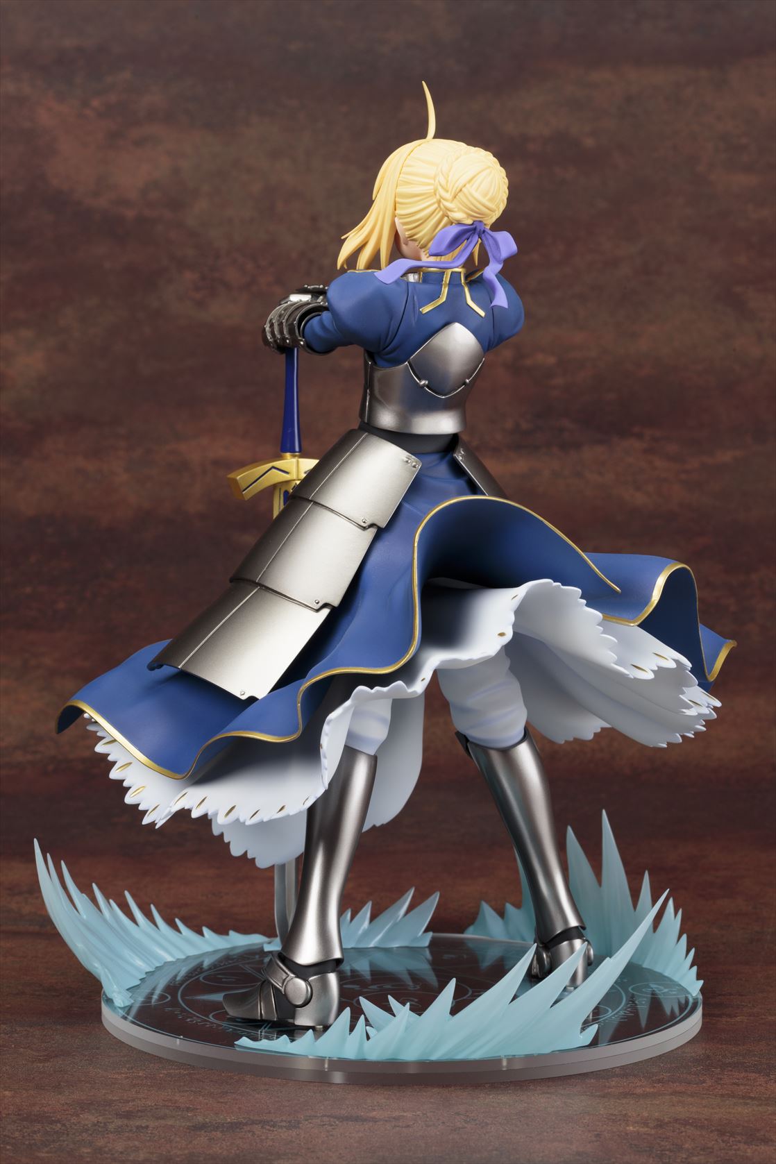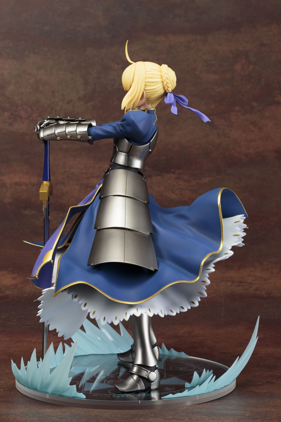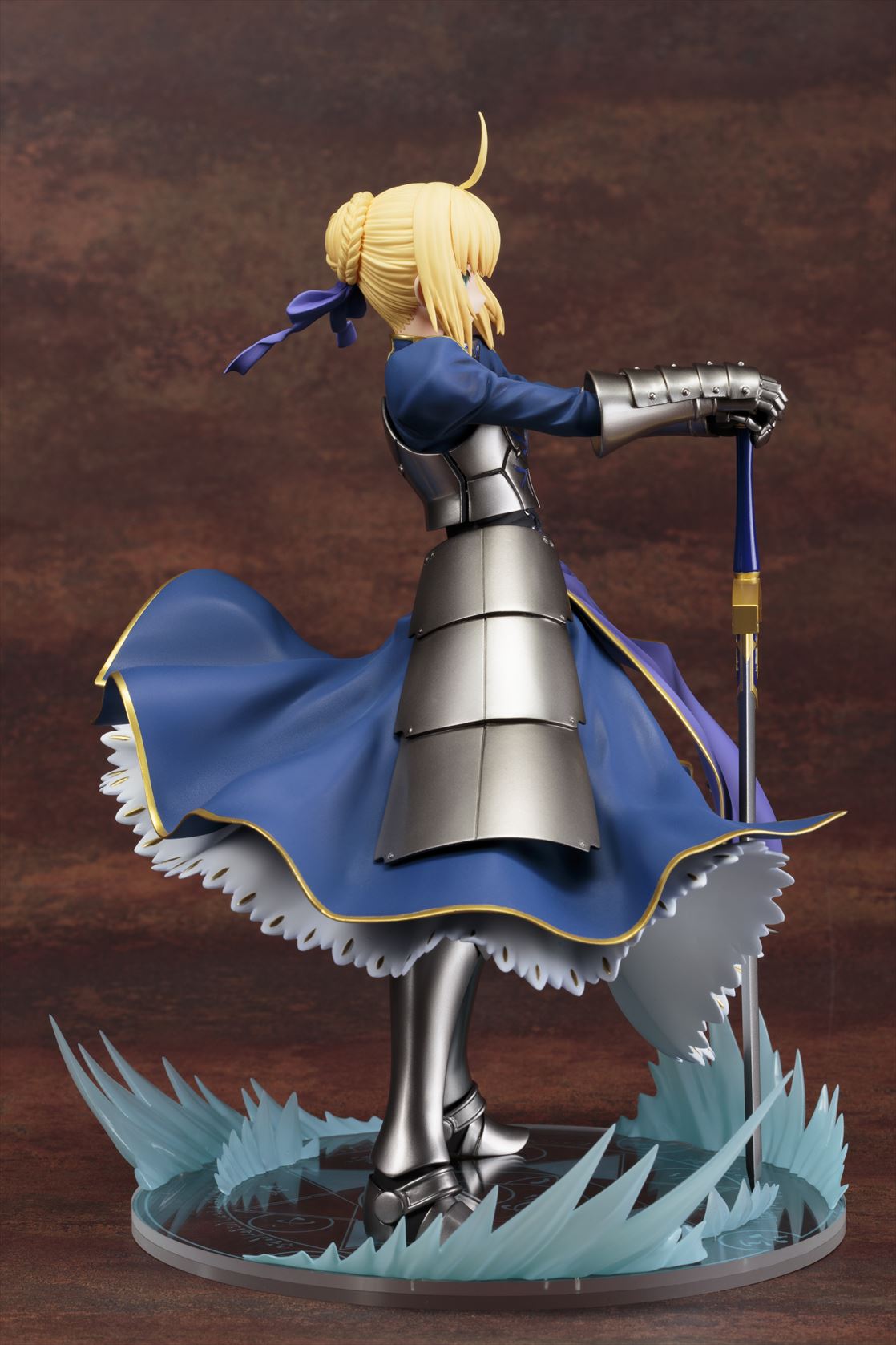 セイバー自身は泰然とした「静」のポーズであるにもかかわらず、大きくなびいた衣装が「動」のアクセントとなり、迫力の存在感を醸し出しています。その衣装のなびきは台座に描かれた魔法陣を走るエフェクトと連動しており、ひとつの情景を思わせる仕上がりになっています。