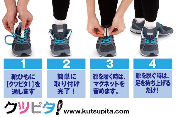 【クツピタ!】は、スニーカーの靴ひもに通すだけで、面倒な脱ぎ履きを1秒で可能にしてしまう、