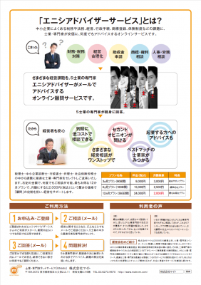 [ENishi Adviser]は、そうした経営者をサポートするべく誕生しました。税務会計、特許・著作権、人事労務、経営戦略、行政手続きといった経営に関する悩みや疑問を、それぞれの専門家に、WEBを通じて何度でも相談できるのが特徴。PCはもちろん、スマートフォンでもご利用になれます。