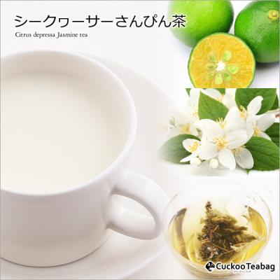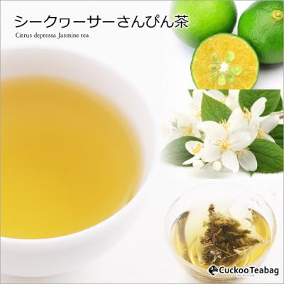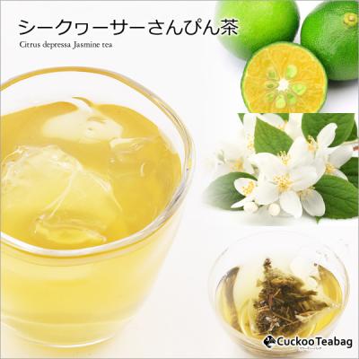 【シークワーサーさんぴん茶△(サンカク)ティーバッグ】は、緑茶にジャスミンの香りを吸着させて作る、優しい花の香りのさんぴん茶に、オレンジピールとジャスミンの花をブレンド。沖縄特産の香酸柑橘、シークワーサーの爽やかな香りを添えました。