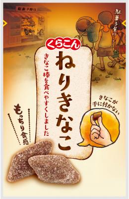 昔懐かしい、「きなこ棒(きなこを水飴と練り合わせ、表面にきなこをまぶした駄菓子)」を指でつまんでもきなこが手に付きにくいようにし、きなこを中にしっかりと練り込みました。この商品は現代の忙しい人たちでも手軽に場所を選ばずに「きなこ棒」を楽しんで頂けるように一口サイズにし、さらに食感も何度も食べたくなるように硬すぎず、柔らかすぎず丁度良い、しかも一般的な「きなこ棒」よりも「もっちり」とした食感に仕上げました。また、近年ではお菓子においても健康志向がみられ、この「ねりきなこ」は発売以来そのような方を中心にご好評頂いております。