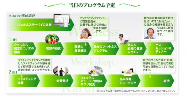 ■プログラム:ウェルネス経営についての講座/理想の食事解説/ファスティング体験/ゲストセッション等