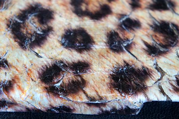 高級蛇革はソフトでウロコがめくれる物です。その上に独自に創作ダブル彩色を行いました。