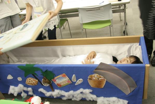 写真:参加者自身が装飾した棺を使った入棺体験