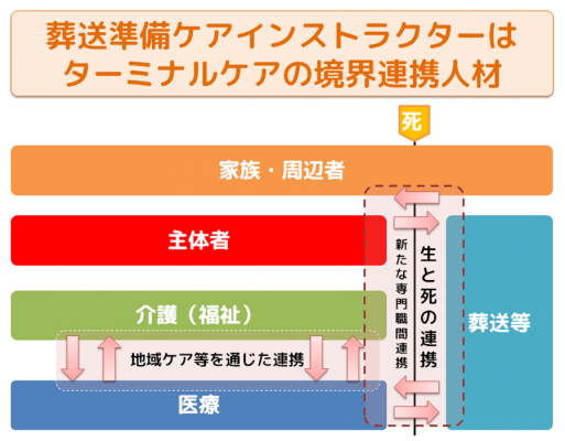 葬送準備ケア(終活ケア)インストラクターは、死というプロセスを統合的に捉え、医療・介護・葬送など様々な専門職間の連携を担い、主体者(療養者)の立場に立ったサポートを行う新たな専門職です。