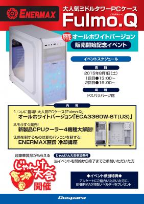株式会社ドスパラ(代表取締役社長:西尾伸雄 本社:東京都千代田区)は、2015年8月1日(土)涼しげでインテリア性の高い人気ミドルタワーPCケース『ENERMAX Fulmo.Q(フルモキュー)"白"モデル』発売記念イベントを開催します。