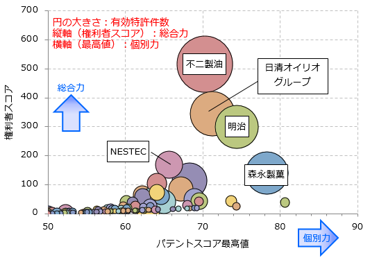 1位 不二製油の注目度の高い特許には、「油性菓子や乳飲料の油性感を改善する製菓用油脂」などが挙げられます。