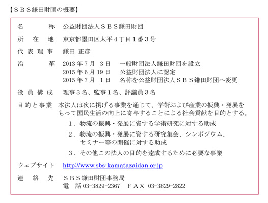 当財団は、社会インフラである物流の学術研究を支援し、物流効率化や事故防止などの研究成果をもって産業全体の発展と国民生活の向上に寄与することを設立趣意としております。SBSグループは、当財団を通じて社会に役立つ物流の振興・発展に貢献してまいります。