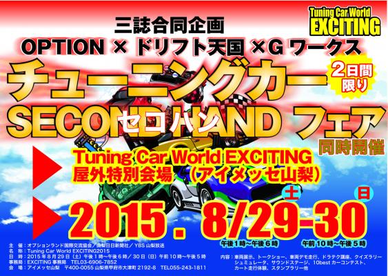 カー雑誌「オプション」・「ドリフト天国」・「Gワークス」による「チューニングカー・セコハン・フェア」を同時開催! カー雑誌がセレクトしたチューニングカーが、「Tuning Car World EXCITING2015」アイメッセ山梨の屋外展示場に展示される。屋内は、アフタパーツメーカーやプロショップが誇るTuningCar&Tuned CustomCarの車両展示をはじめ、トークショー、コンテスト、激安価格でパーツ等の販売等が行われ、屋外は、恒例の音だしイベントやデモ走行、セコハンフェアとイベントが盛りだくさんだ!
