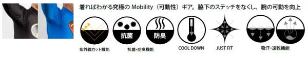 流した汗を素早く吸収・発散することで体温をクールダウン。常にベストパフォーマンスが発揮できるコンディションが維持され肌は常に快適な状態に保たれます。素材は肌にフィットするだけでなく伸縮性にもすぐれており、生地の縫い代の厚みを解消するフラットシーム仕様で肌あたりがよくあらゆる動きをサポート。アスリートの意のままにパフォーマンスをコントロールします。さらに、脇下のステッチをなくしたことにより腕の可動を向上した究極のMobility(可動性)を実現しました。抗菌防臭機能がありイヤな臭いの原因となる細菌の増殖を抑制し、防臭効果を発揮します。UV加工も施されていますので日焼け対策にも対応。