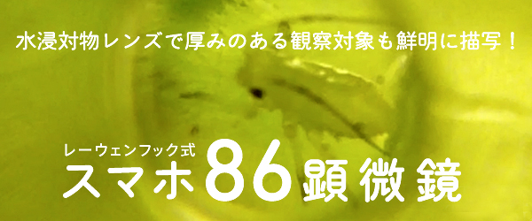 TOCOL スマホ86顕微鏡は、撥水性に優れたレンズブラケットと軽量なプレパラートによって観察対象と対物レンズの間の水が適度な厚みを保持できるようになっているため、厚みのある微生物や植物などの観察に威力を発揮する。