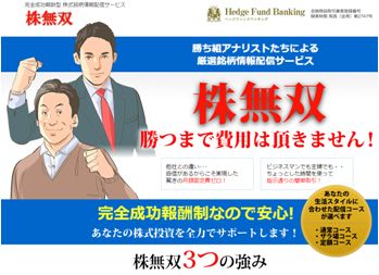 株式銘柄の売買情報を成功報酬で受け取れる「株無双」は、お送りした銘柄情報が目標株価に到達しない限り料金が発生しない金融庁認定の投資助言サービスです。