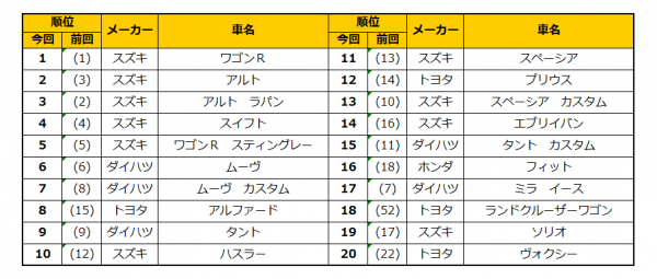トップは王者「ワゴンR」で変わらずでしたが、先月ランキング外から3位に大躍進した「アルト」は更に順位を上げ2位まで上り詰めました。軽自動車が強い当ランキングにおいて今回躍進したのは、15位から8位に上昇した「アルファード」、52位から18位にジャンプアップした「ランドクルーザーワゴン」、3月以来4ヶ月ぶりのランクインとなる「ヴォクシー」の3車種!