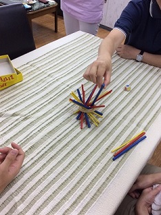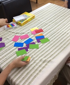 イベントへの参加者が現れると「スティッキー」というドイツ製のバランスゲームを、白坂氏や作業療法士の方を交えて楽しみました。次に白坂氏が独自に制作したカードゲーム「JERRY!」を使って数種類のゲームを行いました。トランプがより単純になったような鮮やかなカードのゲームを、さらに柔軟なルール変更で遊ぶことで、参加者は初めてのプレイでも楽しく遊ぶことができました。